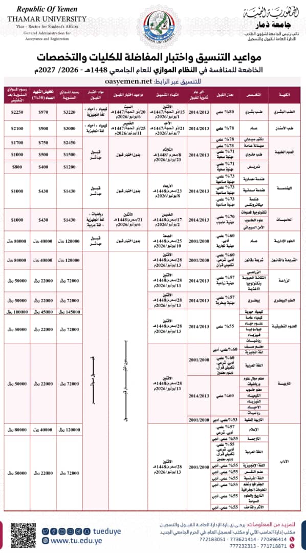 هام.. نيابة شئون الطلاب بجامعة ذمار شروط التنسيق والقبول بجامعة ذمار للعام الجامعي 1446هـ 2024-2025م ( بالنظام العام)