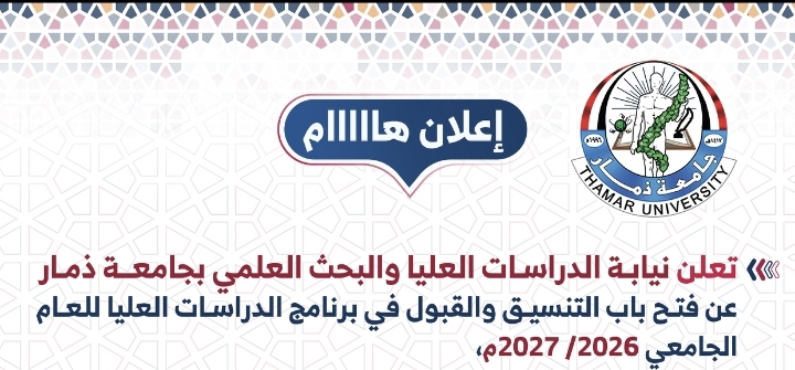 ■تعلن نيابة الدراسات العليا والبحث العلمي بجامعة ذمار عن تمديد فترة التنسيق والقبول في برامج الدراسات العليا (دبلوم- ماجستير) للعام الجامعي 2023/ 2024م، حتى تاريخ: 20 سبتمبر 2023.. في الكليات التالية: (طب الآسنان - الحاسبات والمعلوماتية - العلوم التطبيقية - الآداب - التربية)..